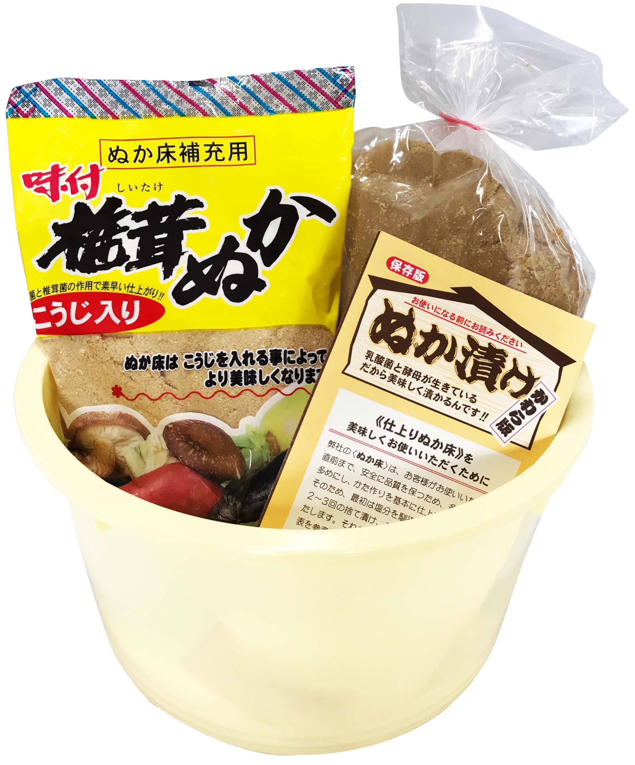 このタルに野菜を入れて漬け込むだけのぬか床です。添付の補充用椎茸ぬかは、補充用として使います。便利な使い方、Q&Aのしおり入り。乳酸菌と酵母が生きている「生」タイプ。ぬか漬けは乳酸発酵により美味しく漬かるお漬物です。調味漬けしたぬか床とは違い本格的なぬか漬けが漬かります。