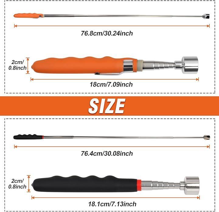 伸縮式デザイン:マグネットピックアップツールには長いハンドルがあり、黒のピックアップツールは181mmから約764mmまで延長でき、オレンジ色のピックアップツールは180mmから約768mmまで延長できるため、近くまたは遠くのオブジェクトを収集できます。