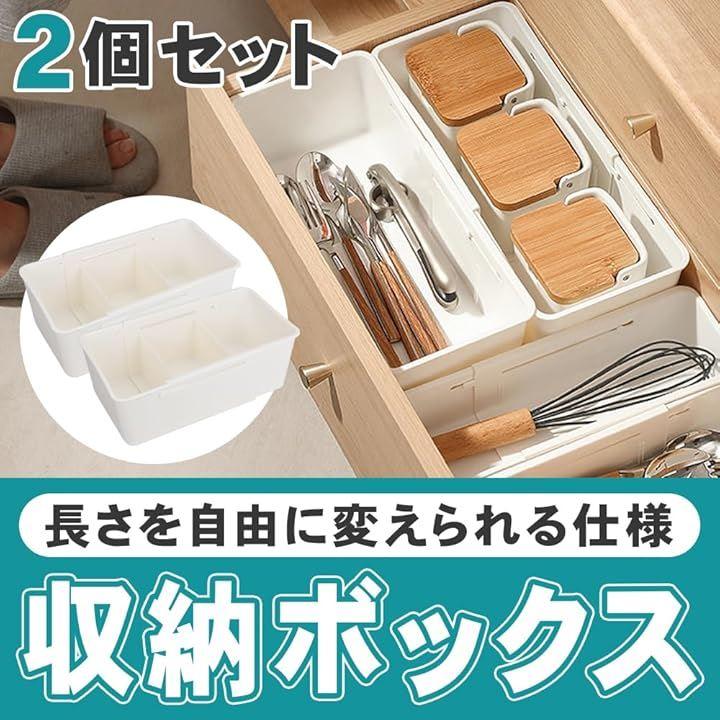 「セット内容」伸縮式収納ボックスx2点 仕切り板x4枚 「サイズ(約)」27cm~38.5cmx14.5cmx9.5cm 「カラー」ホワイト 「材質」プラスチック