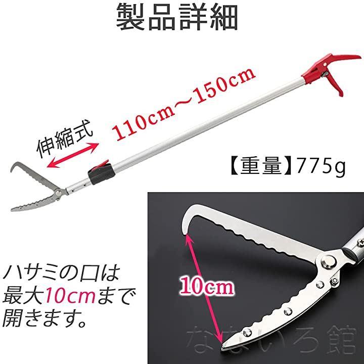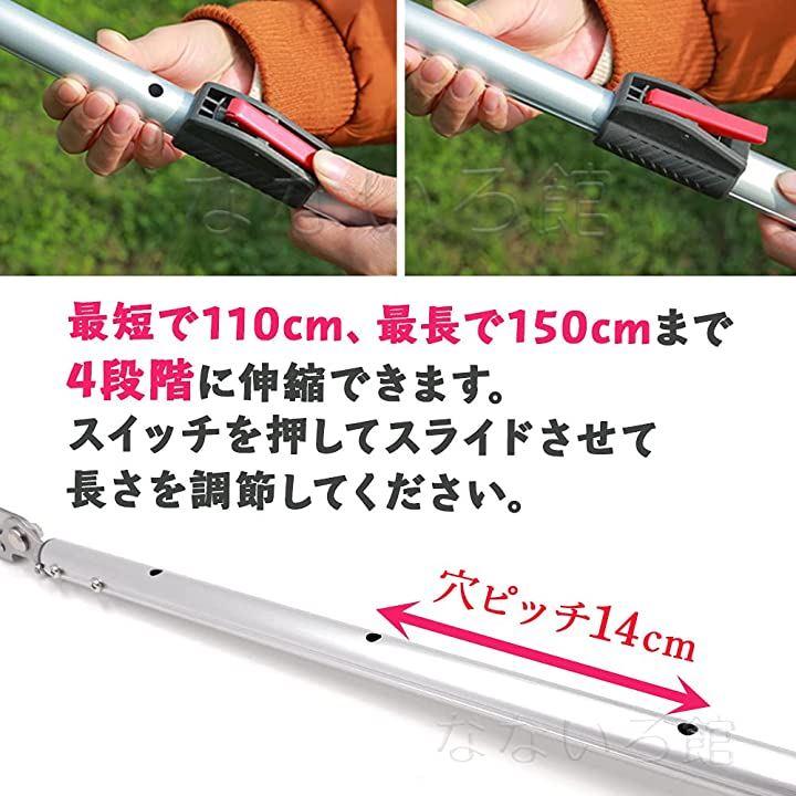 ・「サイズ」最短110cm 最長150cm 伸縮4段階 穴ピッチ14cm ハサミの口最大10cmまで開く「重量」775g 4段階に伸縮できます。