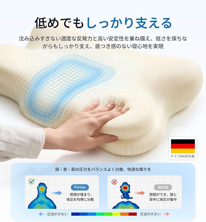「高品質素材x徹底した安全性。安心して使える」Pursay低反発枕は、ドイツBASF社製の高品質メモリーフォームを採用し、沈み込みすぎず適度な反発力と高い安定性を兼ね備え、頭の形にゆっくりとフィットし、就寝中の頭・首・肩への圧力をバランスよく分散し、しっかりと支えます。