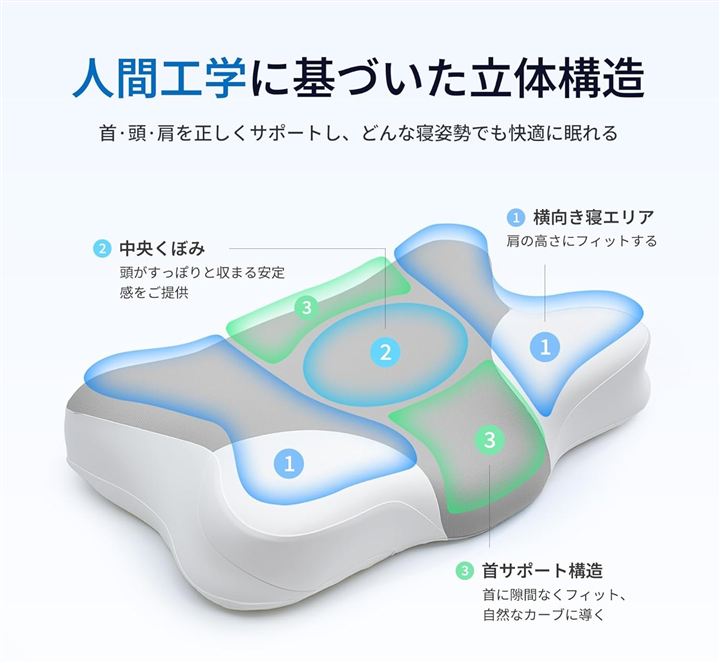 「低い枕難民向け。3D人間工学立体設計の低い枕」「首や肩に違和感があり、一般的な低い枕では物足りない」や「一般的な人間工学立体枕は高すぎて、なかなか眠れない」そんなお悩みを抱える、低い枕をを好む方や普段枕を使わない方のために特化して開発された3D立体構造薄い枕です。