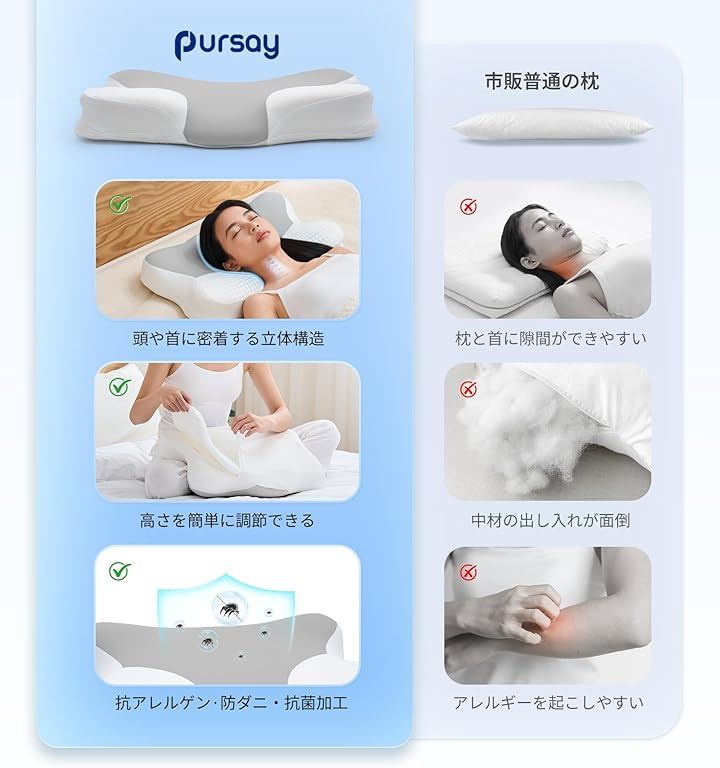 Pursay首が痛くならない枕は、無理のない快適な低さで首や肩への負担を減らすだけでなく、独自設計の首サポート構造が首とマットレスのすき間を自然に埋め、浅くなった首のカーブもやさしく支えます。
