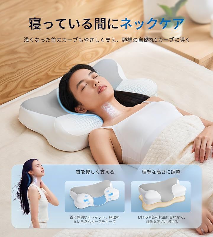 さらに、首の状態に合わせて高さ調整が可能なため、自然なカーブを保ちやすい睡眠環境を整え、寝ている間も心地よく首をサポートします。