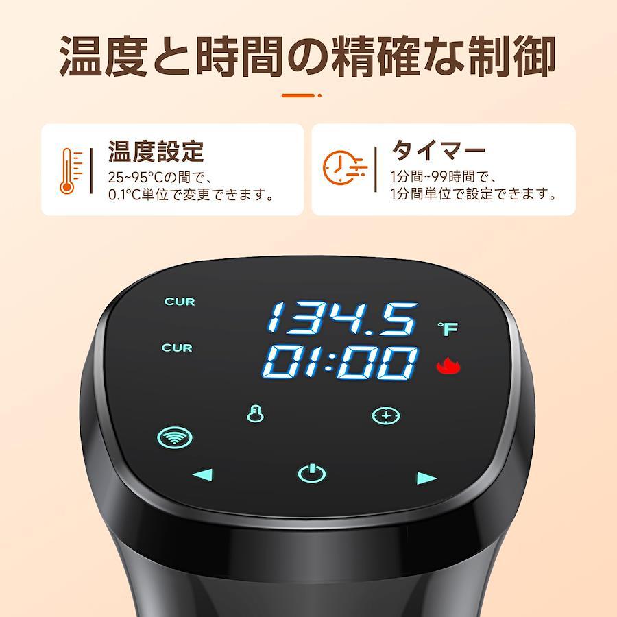 【24時間タイマー予約 時間と温度をコントロール】「タイム設定」を長押ししてタイマー予約機能に入ります。予約設定が完了すると、低温調理機が自動的に起動する。就寝前や出勤前に予約をして、起床後や帰宅時にすぐ食べられる。従来の調理では、火加減を把握するために常に注意を払う必要がある。この低温調理機には、スマートメタル温度センサーが搭載されて、過度調理の心配を気にせず、精確な時間に正確な温度で加熱してくれる。焦げる心配もなく、最大限食材の栄養素と風味を保留できる。 *温度設定は25 - 95℃まで、精度は±0.1°Cとなる。 時間設定は1分刻みで、0時間 - 99時間になる。