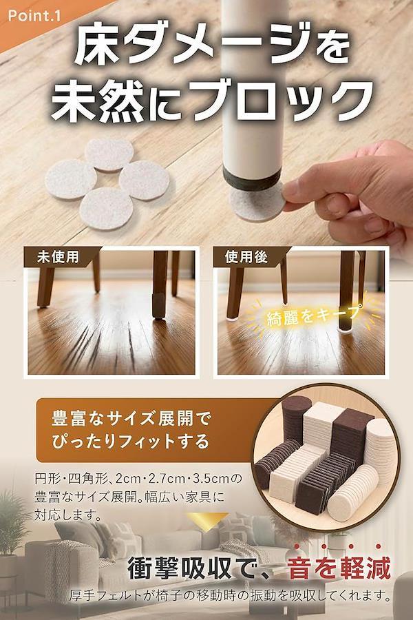 「商品仕様」 フェルト素材/厚さ約2.5mm/円形・四角形/直径2cm・2.7cm・3.5cm/カラー:ブラウン・ベージュ/粘着式/枚数バリエーション有