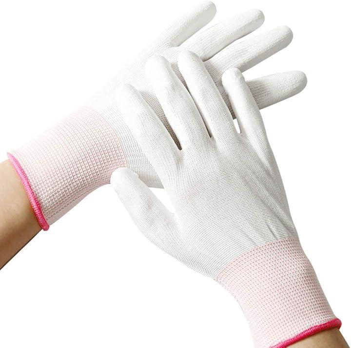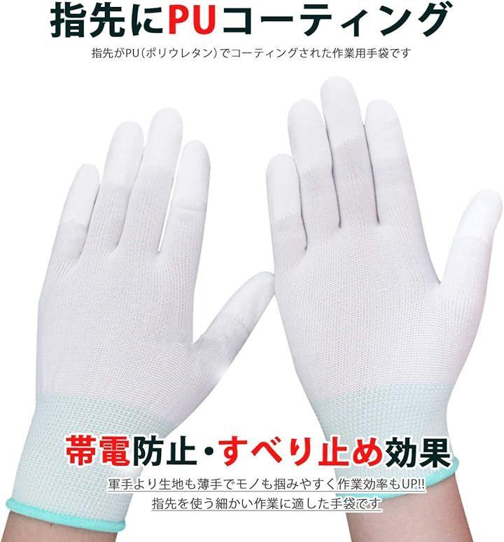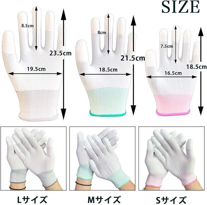 「商品内容」作業用手袋:24枚(12組)<Sサイズ(約)> 全長:18.5cm、中指の長さ:7.5cm、手のひら周り:16.5cm <素材> 指先:PU 編手:ナイロン カラー:ホワイト *帯電防止、すべり止め