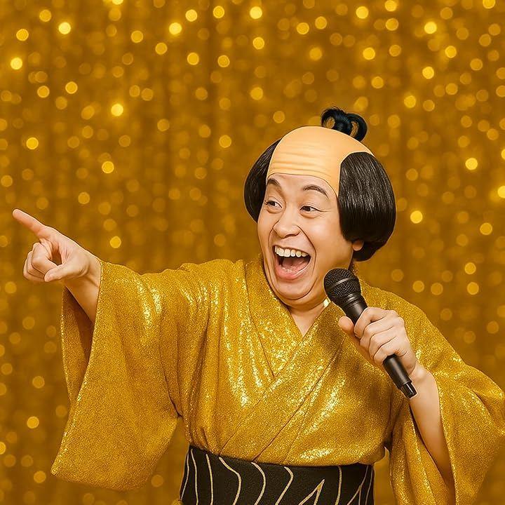 ちょんまげ付きのハゲカツラ風デザインで、見た人の笑いを誘い、忘年会や新年会、ハロウィンの仮装パーティーで注目間違いなし。
