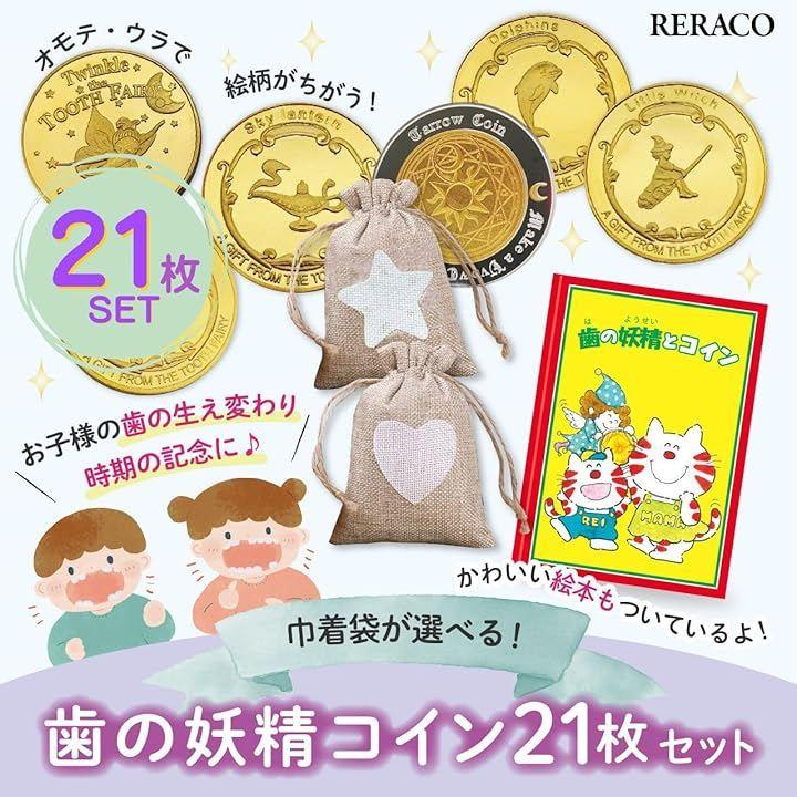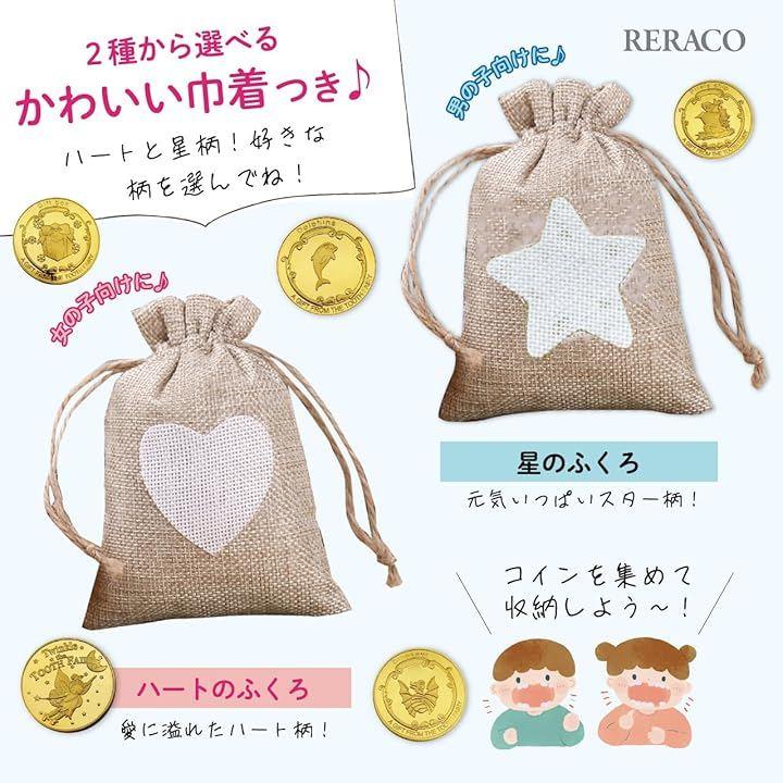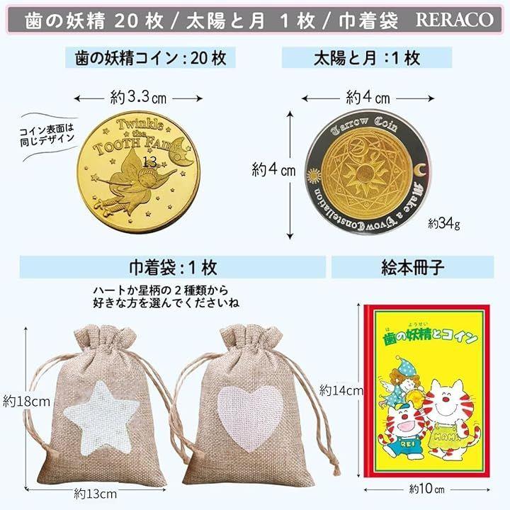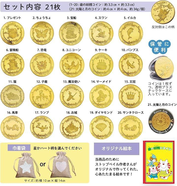 歯の妖精から美しい記念コインのプレゼント。ここでしか手に入らないストップペイルの歯の妖精のお話の絵本がセット。そして、男の子向けに星柄の麻の巾着、女の子向けにハート柄の麻の巾着付き。