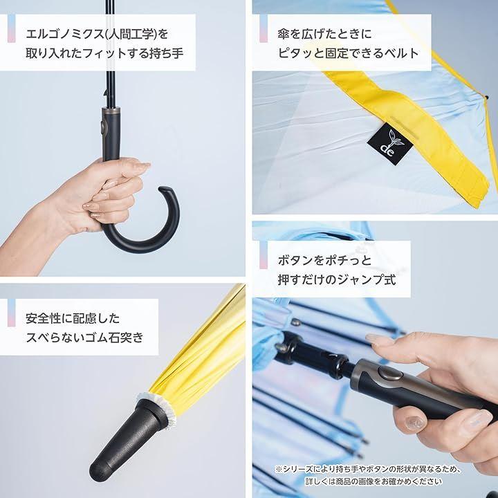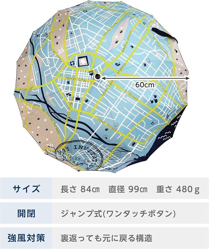 [商品スペック]生地:ポリエステル100% / 骨組:グラスファイバー(16本) / 全長:84cm/開いた直径:99cm/布地の半径:60cm/重量:480g / 先端(石突き):スベり止め強力ゴム/留めベルト:面ファスナー/ 生地:260T/撥水性:4等級/紫外線対策:UVカット98%・UPF50+ / カラー:全15色 / タイプ:ジャンプ傘