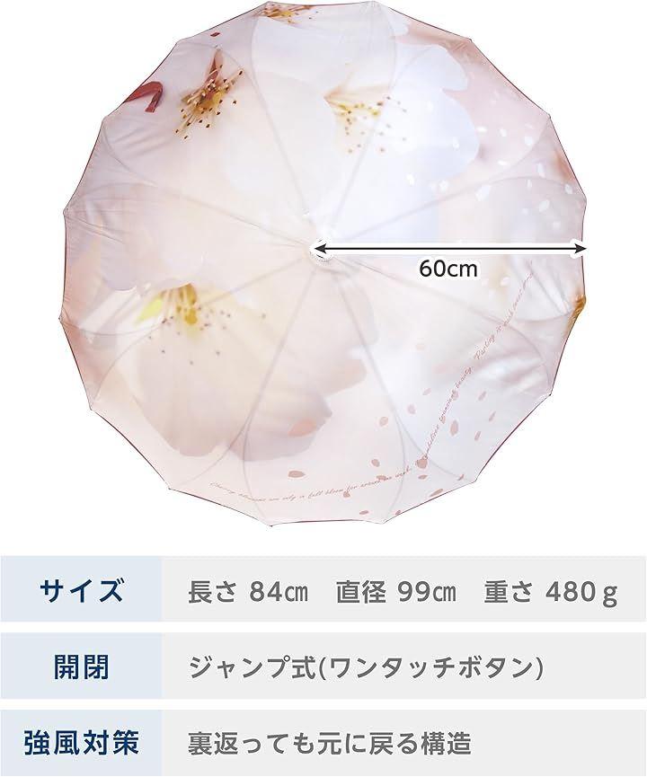 [耐風] いつも風で骨が折れてしまう...という方に ・メインの骨がすべて釣り竿のようにしなるグラスファイバー製 ・メインの骨がグラスファイバー製だからさびにくくて劣化しにくい ・通常の倍の16本も骨がある ・お花のような形の特殊な組み方をしている 「風でひっくり返ってしまっても一瞬で戻せるくらい」とっても丈夫なんです。 [使いやすさ] ・石突きの先端は滑りにくいラバー製 ・ヒラヒラしない止めベルト、自然に本体に付くよう考えた面ファスナー付 ・ニットにひっかっからない。すっきりとしたジャンプボタン [一枚張り(シームレス)] ・縫い目のない一枚張りの生地 ・まるで絵画のようなイラストを全面に表現 ・縫い目からの雨漏りリスクを軽減 通常の婦人傘では小さく感じるけど紳士傘を持つのはちょっと違う...という方に ・16本の骨があることで、生地面積が広くなるから同じ大きさでも差したときだけちょっと大きめ ・メインの骨がグラスファイバー製だから鉄製の骨よりもちょっと軽量 ・紳士傘と違って華やかなデザインが豊富 [スペック] *素 材 生地:ポリエステル100%/骨:グラスファイバー *サイズ 親骨の長さ:60cm *全長総丈の長さ:84cm *重さ重さ:480g 「ご注意」 *撥水性の高い柔らかい生地の特性上、通常の傘よりシワが見受けられる場合がございます。
