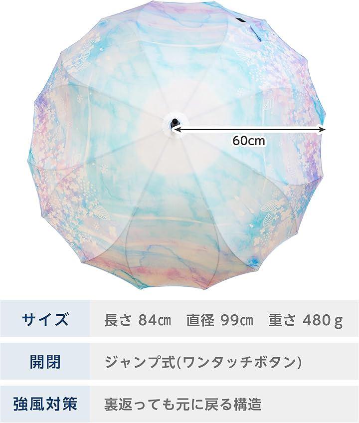 [耐風] いつも風で骨が折れてしまう...という方に ・メインの骨がすべて釣り竿のようにしなるグラスファイバー製 ・メインの骨がグラスファイバー製だからさびにくくて劣化しにくい ・通常の倍の16本も骨がある ・お花のような形の特殊な組み方をしている 「風でひっくり返ってしまっても一瞬で戻せるくらい」とっても丈夫なんです。 [使いやすさ] ・石突きの先端は滑りにくいラバー製 ・ヒラヒラしない止めベルト、自然に本体に付くよう考えた面ファスナー付 ・ニットにひっかっからない。すっきりとしたジャンプボタン [一枚張り(シームレス)] ・縫い目のない一枚張りの生地 ・まるで絵画のようなイラストを全面に表現 ・縫い目からの雨漏りリスクを軽減 通常の婦人傘では小さく感じるけど紳士傘を持つのはちょっと違う...という方に ・16本の骨があることで、生地面積が広くなるから同じ大きさでも差したときだけちょっと大きめ ・メインの骨がグラスファイバー製だから鉄製の骨よりもちょっと軽量 ・紳士傘と違って華やかなデザインが豊富 [スペック] *素 材 生地:ポリエステル100%/骨:グラスファイバー *サイズ 親骨の長さ:60cm *全長総丈の長さ:84cm *重さ重さ:480g 「ご注意」 *撥水性の高い柔らかい生地の特性上、通常の傘よりシワが見受けられる場合がございます。