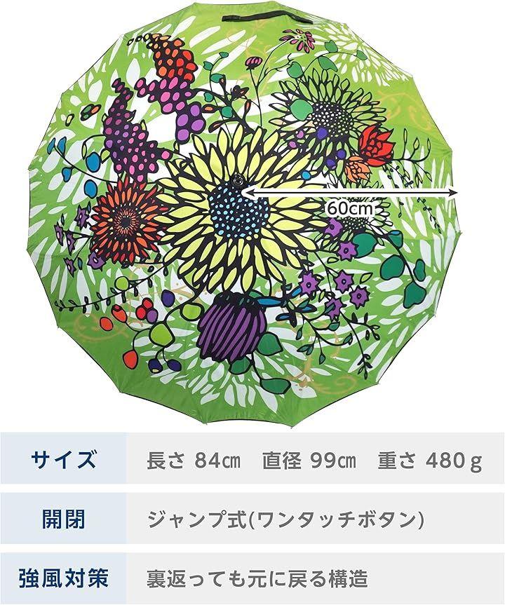 [耐風] いつも風で骨が折れてしまう...という方に ・メインの骨がすべて釣り竿のようにしなるグラスファイバー製 ・メインの骨がグラスファイバー製だからさびにくくて劣化しにくい ・通常の倍の16本も骨がある ・お花のような形の特殊な組み方をしている 「風でひっくり返ってしまっても一瞬で戻せるくらい」とっても丈夫なんです。 [使いやすさ] ・石突きの先端は滑りにくいラバー製 ・ヒラヒラしない止めベルト、自然に本体に付くよう考えた面ファスナー付 ・ニットにひっかっからない。すっきりとしたジャンプボタン [一枚張り(シームレス)] ・縫い目のない一枚張りの生地 ・まるで絵画のようなイラストを全面に表現 ・縫い目からの雨漏りリスクを軽減 通常の婦人傘では小さく感じるけど紳士傘を持つのはちょっと違う...という方に ・16本の骨があることで、生地面積が広くなるから同じ大きさでも差したときだけちょっと大きめ ・メインの骨がグラスファイバー製だから鉄製の骨よりもちょっと軽量 ・紳士傘と違って華やかなデザインが豊富 [スペック] *素 材 生地:ポリエステル100%/骨:グラスファイバー *サイズ 親骨の長さ:60cm *全長総丈の長さ:84cm *重さ重さ:480g 「ご注意」 *撥水性の高い柔らかい生地の特性上、通常の傘よりシワが見受けられる場合がございます。