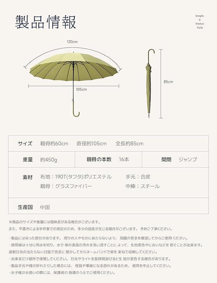 サイズ:全長:約84cm 親骨60cm 使用時直径:約105cm 本体重:約450g