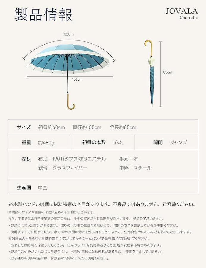 本体重:約450g サイズ:全長約:85cm、親骨:60cm、使用時直径:約105cm