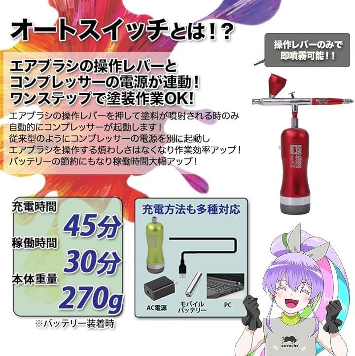 実際に使う人が考えたアイディアが詰まっています。 革命的機構搭載。。 オートスイッチ機能は物理スイッチから圧感知型にバージョンアップ。。エアブラシの操作レバーとコンプレッサーの電源が連動、塗装時のみ電源が自動起動。