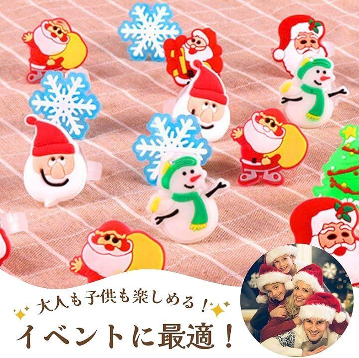 「クリスマス気分満点」 50個セットの光る指輪には、雪だるま、ペンギン、鹿、クリスマスツリーなど、クリスマスらしいデザインが満載です。