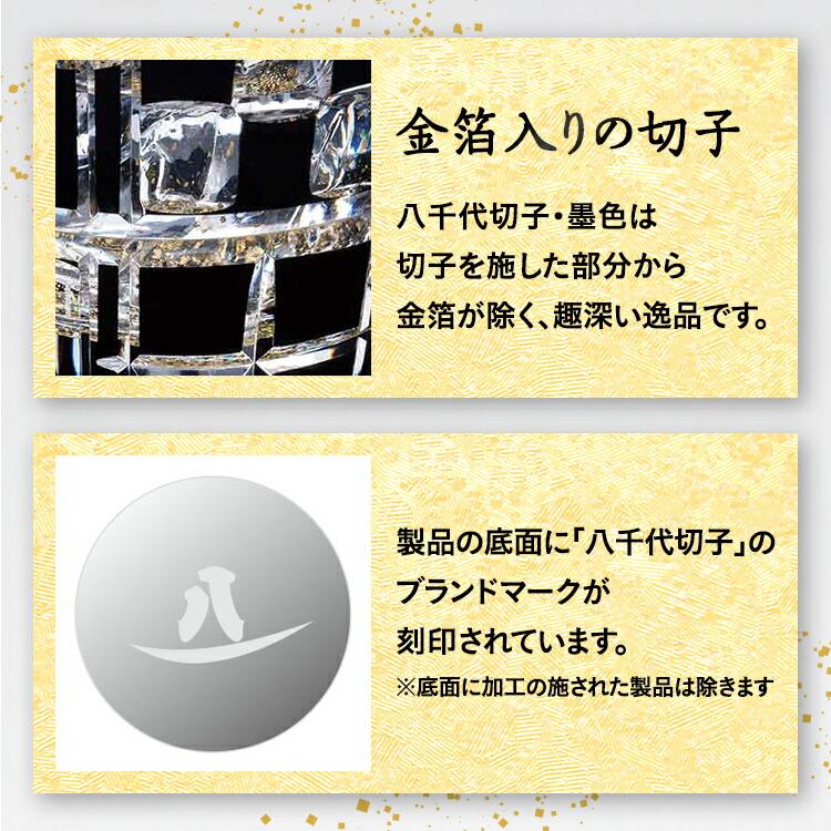 シリーズ 八千代切子入数 1個サイズ 口径82×高さ90・最大径82mm容量・重さ 容量:255ml 重さ:305g材質 クリスタルガラス原産国 ハンドメイド/日本製(当社千葉工場で製造)食洗機対応 ×特徴●専用木製ギフト箱入り 箱サイズ:(横幅106×奥行114×高さ103mm)●「八千代切子・墨色」は、深みを持った墨色に趣のある切子と金箔を加えることで、多種多様な輝きを楽しめる逸品です。●大胆な切子と繊細な切子の組み合わせから生まれる、見る角度によって異なる輝きや景色を、極上の日本酒とともにお楽しみ下さい。