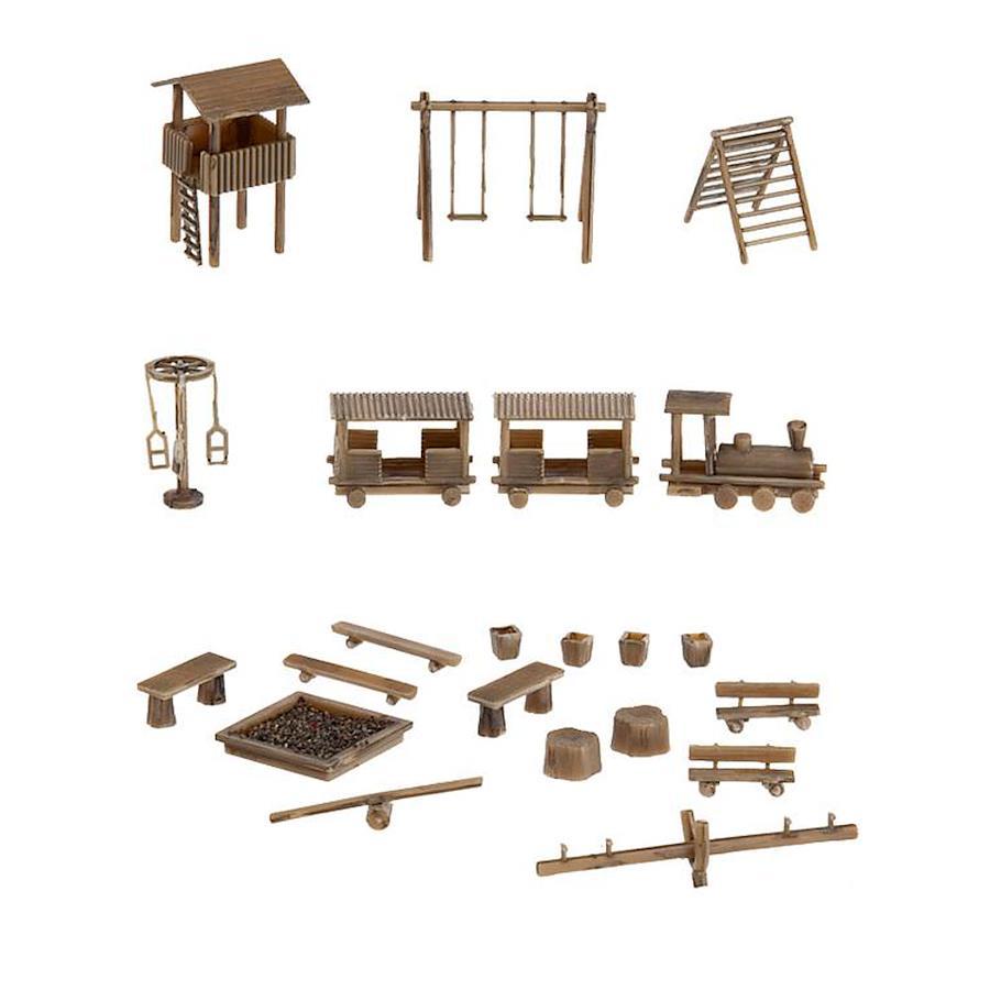 セット内容:テーブルとベンチ、くずかご、シーソー、ブランコ、冒険ハウス、砂場、汽車の遊具など