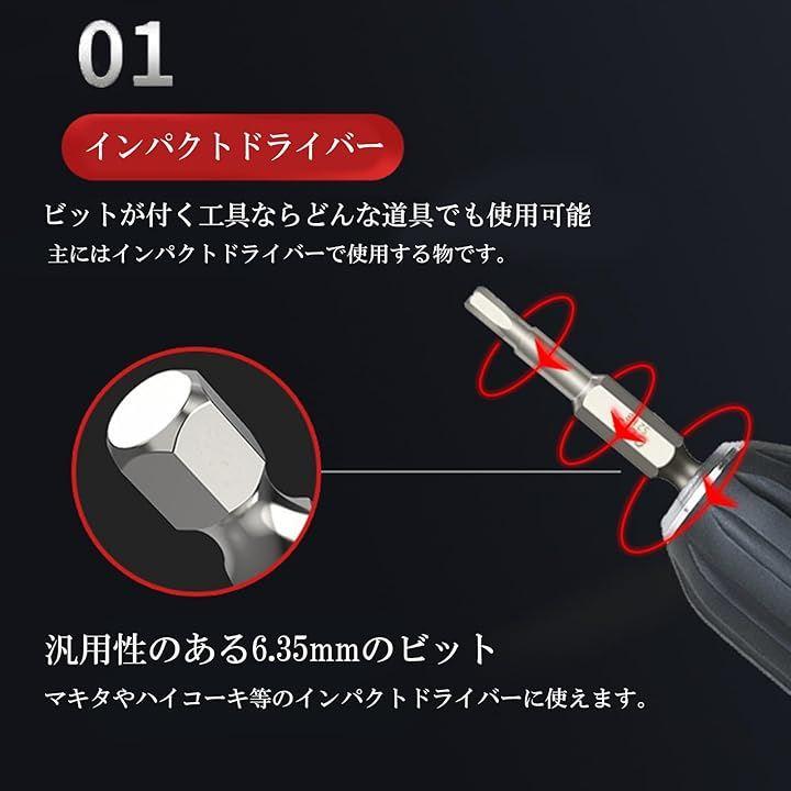 業界標準6.35mm六角シャンクを採用し、マキタ、ハイコーキ(日立)、ボッシュなど主要メーカーの電動ドライバー、インパクトドライバー、充電式ドリルに対応。
