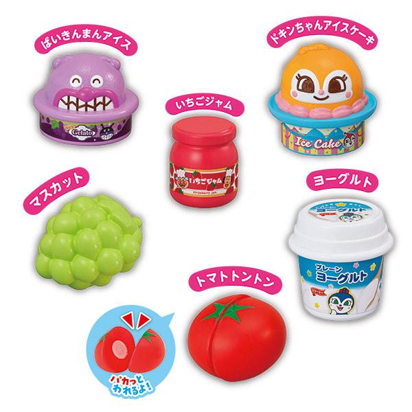 本体、ひきだし、棚板2枚、マスカット、トマトトントン、ドキンちゃんアイスケーキ、ケーキスタンド、ばいきんまんアイス、ヨーグルト、いちごジャム、スポイト