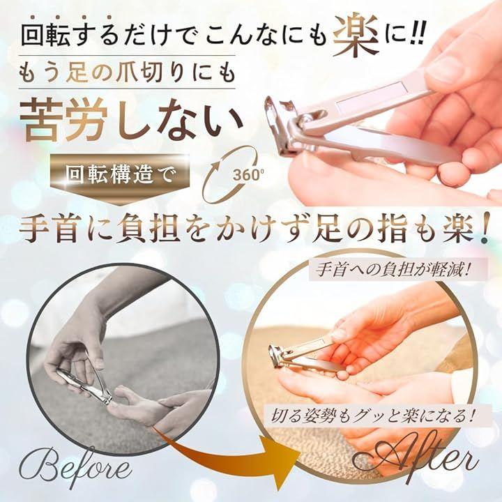 5段階の角度調整と360度回転機構により、足の爪も無理な姿勢を取らずにカットできます。