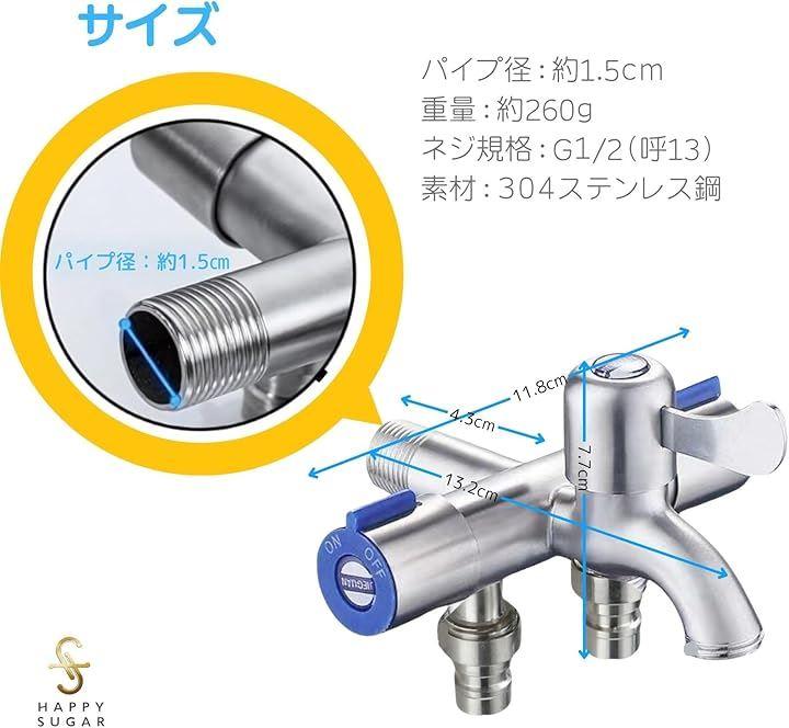 「サイズ」パイプ径約15mm ネジ規格:G1/2(呼13) 重量:約260g 素材:304ステンレス鋼