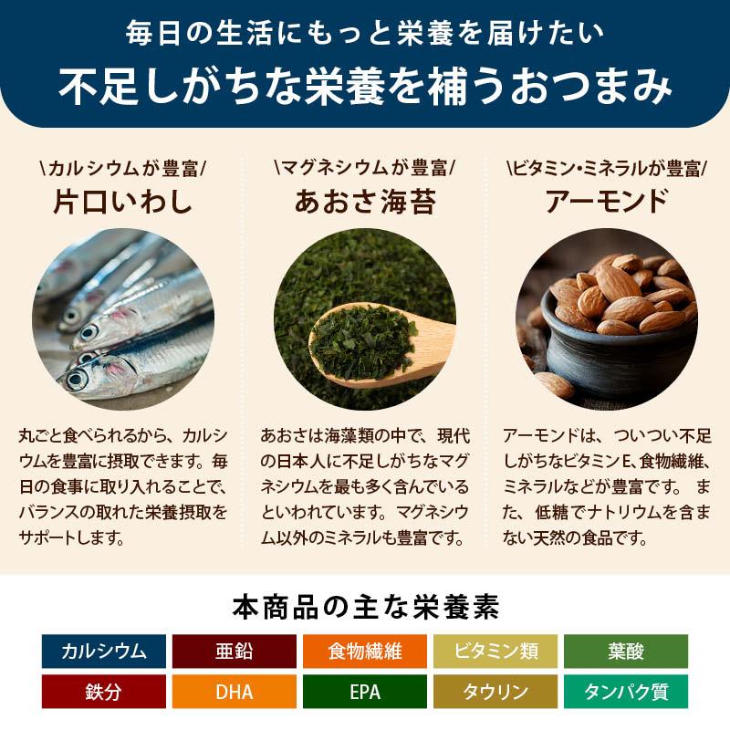食べだしたら止まらない!海の香りが広がるあおさ小魚と、アーモンドが加わったあおさ小魚アーモンド。カルシウム、ミネラル、食物繊維など栄養満点。安心安全な国産小魚。
