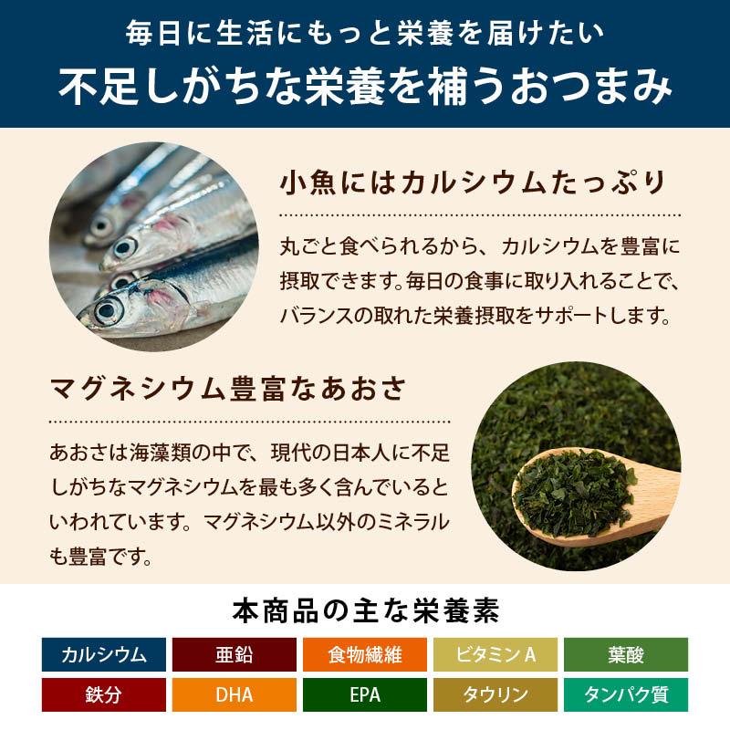 片口いわしに、あおさをふりかけた、磯の香り豊かな商品です。磯の香りとカリカリ食感がくせになります。小魚はほのかに甘い味付けでお子様も食べやすいです。片口いわしのすごいところ、それは何といってもカルシウムの量です。美味しく食べて、栄養チャージしていきましょう。