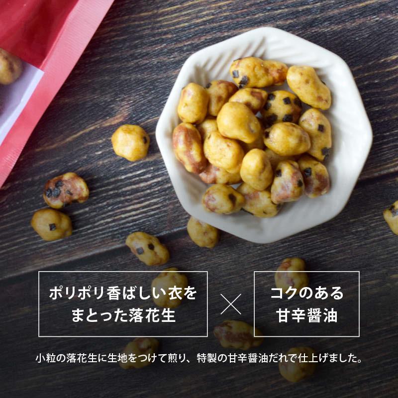 うまみの詰まった小粒の落花生を、特製の九州産甘辛醤油だれの衣で包みました。 どこか懐かしい甘辛和風しょう油味。食べ始めると止まらない美味しさ。おやつやおつまみに。