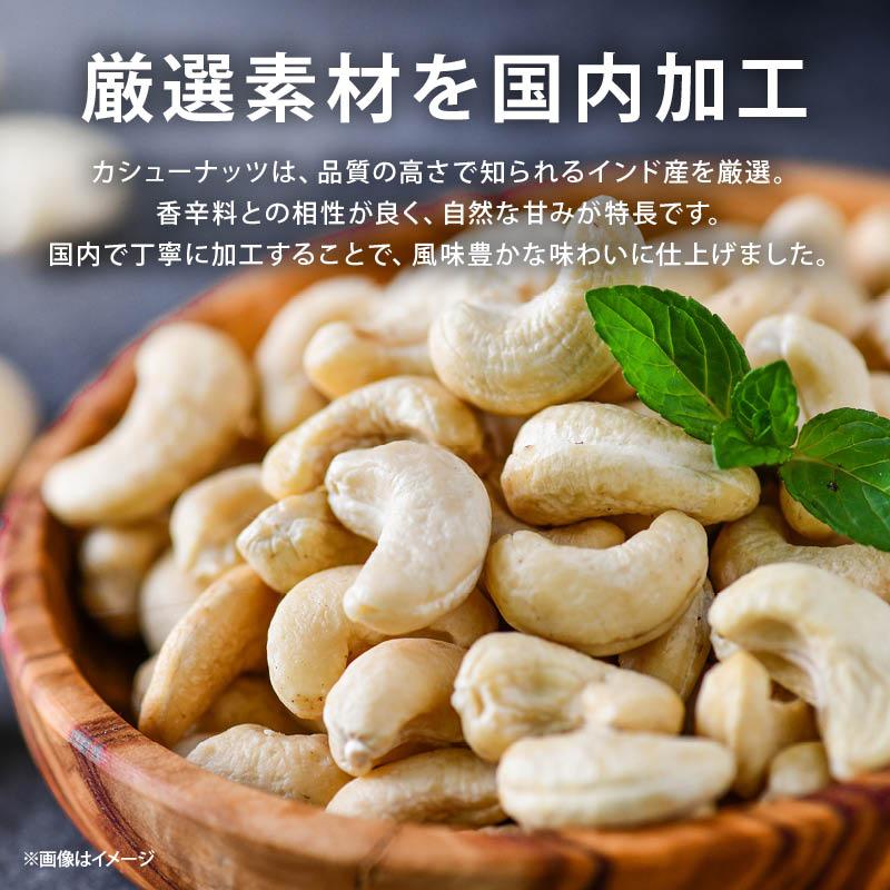 【厳選素材を国内加工】カシューナッツは、品質の高さで知られるインド産を厳選。香辛料との相性が良く、自然な甘みが特長です。国内で丁寧に加工することで、風味豊かな味わいに仕上げました。