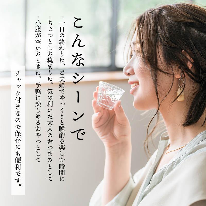 【こんなシーンで】・一日の終わりに、ご夫婦でゆっくりと晩酌を楽しむ時間に・ちょっとした集まりに。気の利いた大人のおつまみとして・小腹が空いたときに、手軽に楽しめるおやつとしてチャック付きなので保存にも便利です。