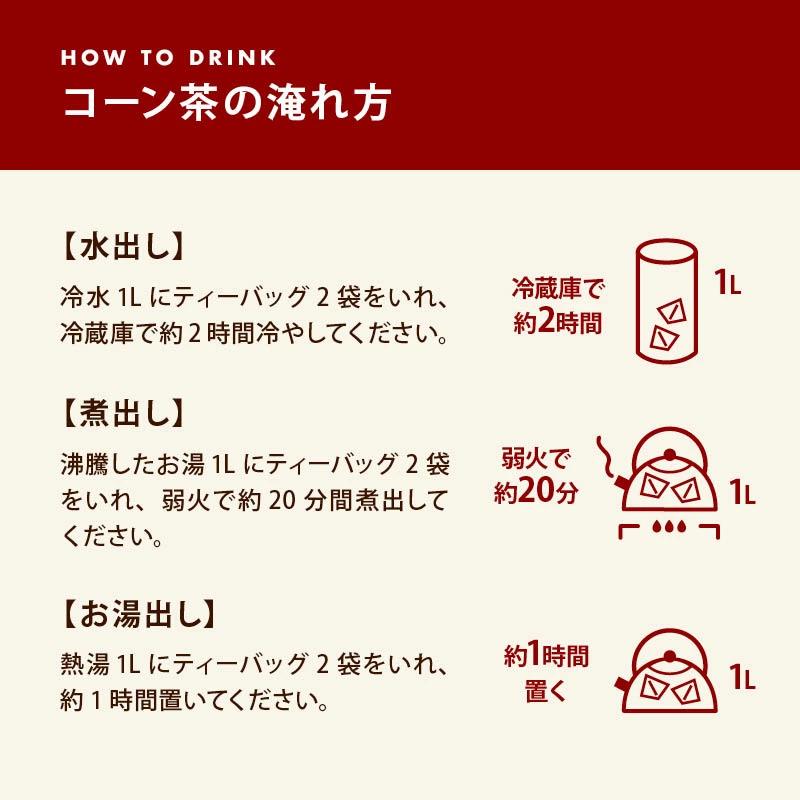 【コーン茶の淹れ方】・水出し冷水1Lにティーバッグ2袋をいれ、冷蔵庫で約2時間冷やしてください。・煮出し沸騰したお湯1Lにティーバッグ2袋をいれ、弱火で約20分間煮出してください。・お湯出し熱湯1Lにティーバッグ2袋をいれ、約1時間置いてください。
