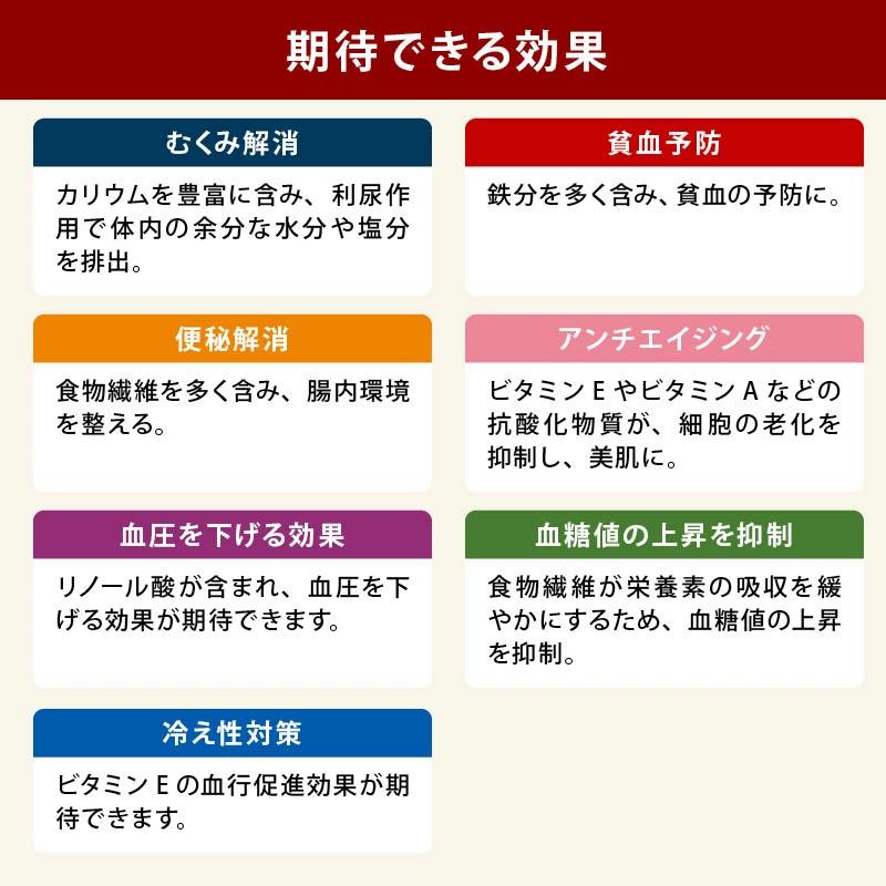 (期待できる効果)むくみ解消カリウムを豊富に含み、利尿作用で体内の余分な水分や塩分を排出。貧血予防鉄分を多く含み、貧血の予防に。便秘解消食物繊維を多く含み、腸内環境を整える。アンチエイジングビタミンEやビタミンAなどの抗酸化物質が、細胞の老化を抑制し、美肌に。血圧を下げる効果リノール酸が含まれ、血圧を下げる効果が期待できます。血糖値の上昇を抑制食物繊維が栄養素の吸収を緩やかにするため、血糖値の上昇を抑制。冷え性対策ビタミンEの血行促進効果が期待できます。