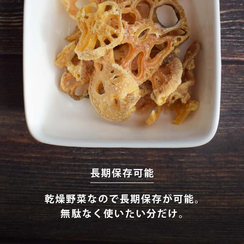 【乾燥野菜3つのメリット】(1)簡単熱湯で戻すだけ!食感はそのまま!使う前に熱湯で戻すだけで旬の味をお楽しみいただけます。生のれんこんのようなアク抜き不要、お湯で戻すだけ。※乾燥野菜れんこんの場合は熱湯で5〜10分程しっかりと戻してください。