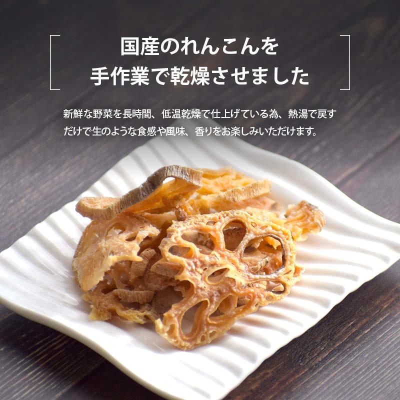 簡単、便利な、国産れんこんの無添加乾燥野菜。ちょっと足りないそんな時にとても便利な逸品です。風味豊かで美味しい「乾燥野菜れんこん」を、ぜひご賞味ください。