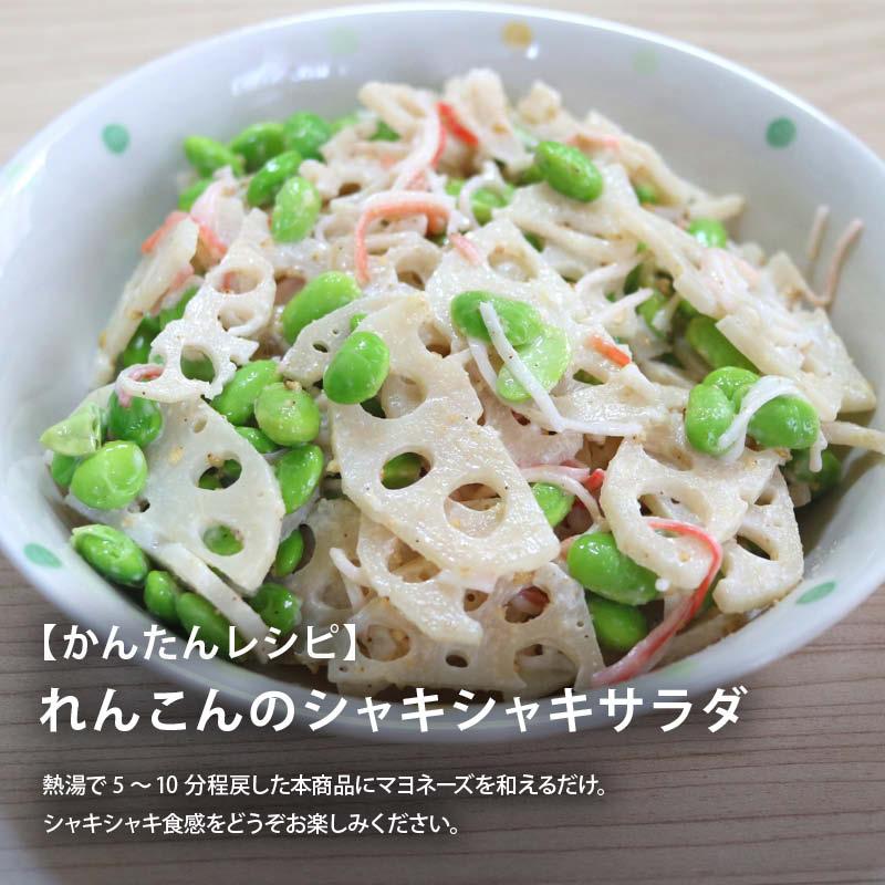 【美味しいお召し上がり方】「れんこんのシャキシャキサラダ」熱湯で5〜10分程戻した本商品にマヨネーズを和えるだけ!シャキシャキ食感をどうぞお楽しみください。