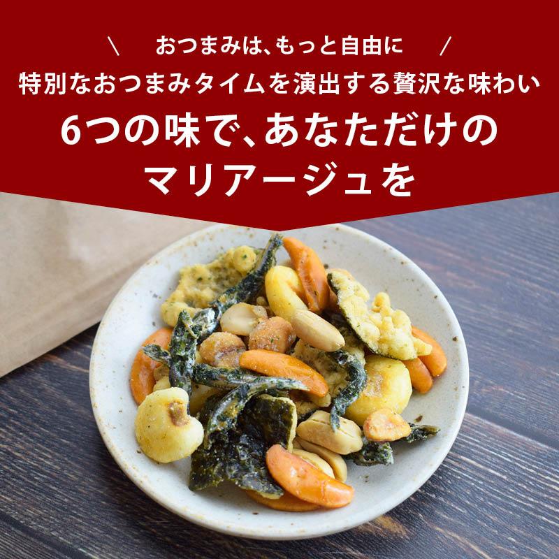 【6種の味が織りなす至福のハーモニー】食べるたびに異なる食感と味わいを楽しめる、飽きのこないおつまみミックス。「次はどれを食べよう?」そんなワクワクが広がる逸品です。