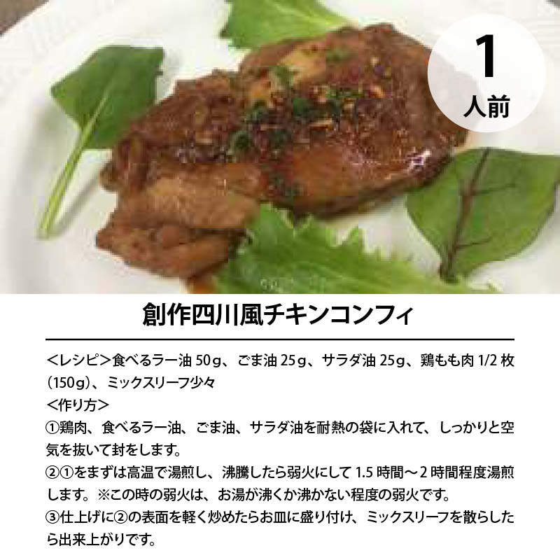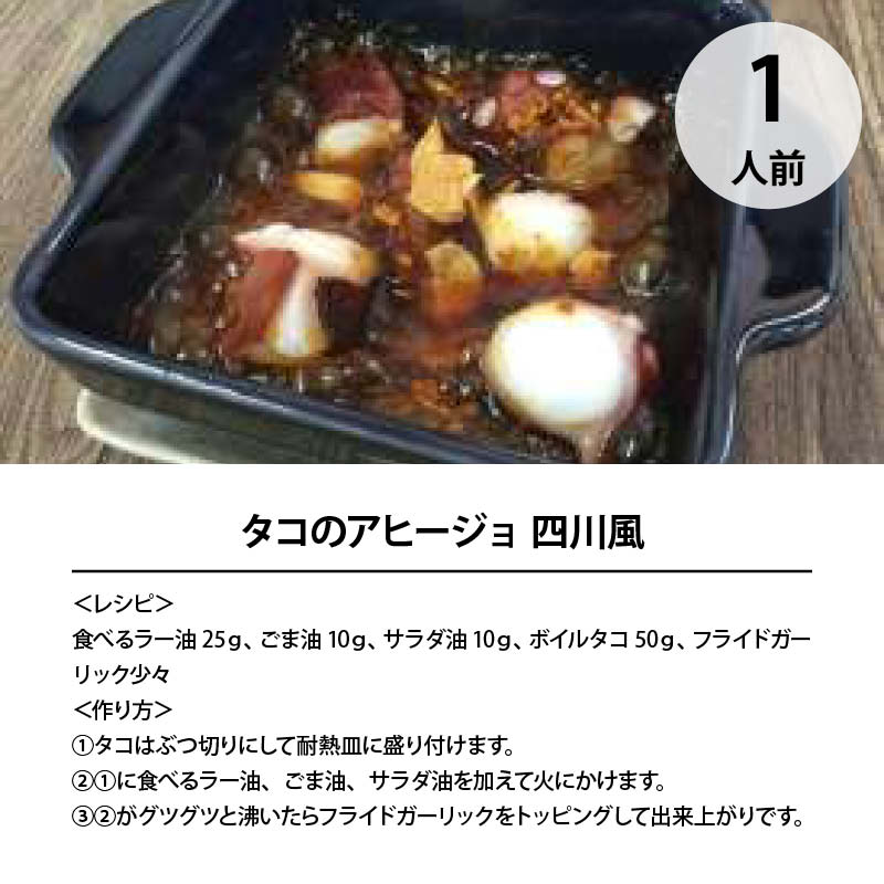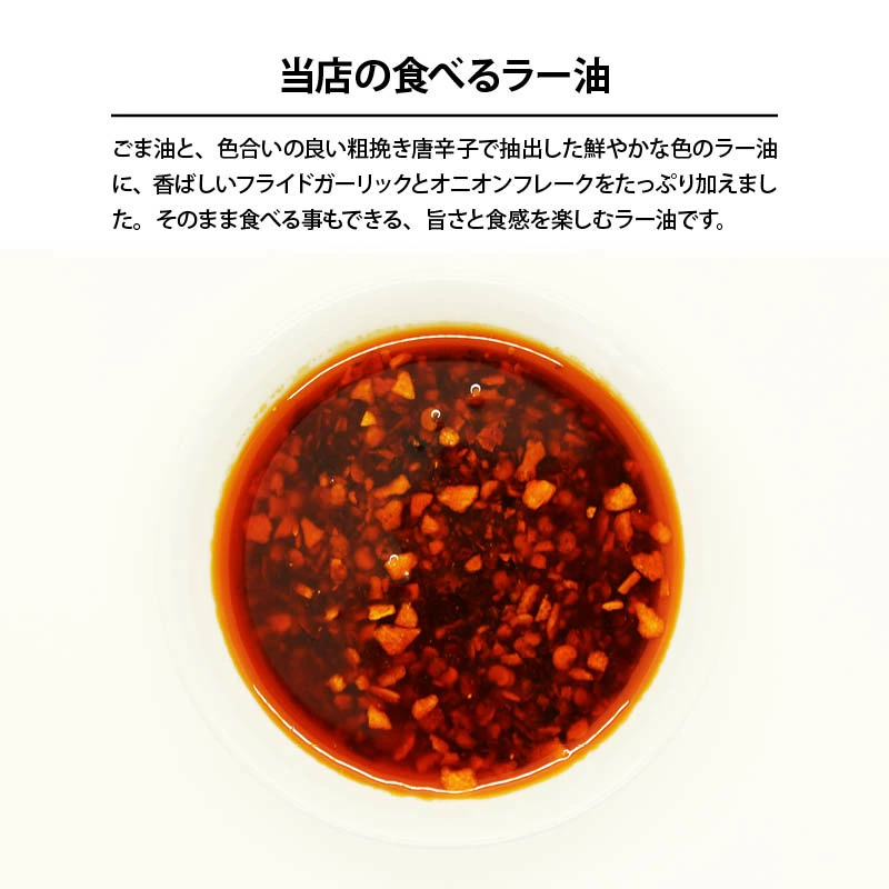 フライドガーリックとオニオンフレークが入った食べるラー油。ごま油と色合いの良い粗挽き唐辛子で抽出した鮮やかな色のラー油を使用しています。