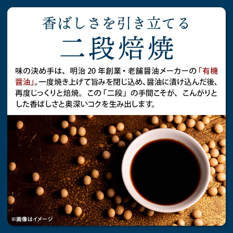 一度焼き上げて旨みを閉じ込め、醤油に漬け込んだ後、再度じっくりと焙焼。