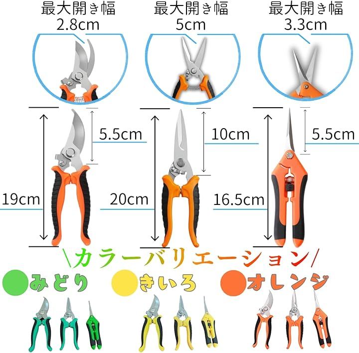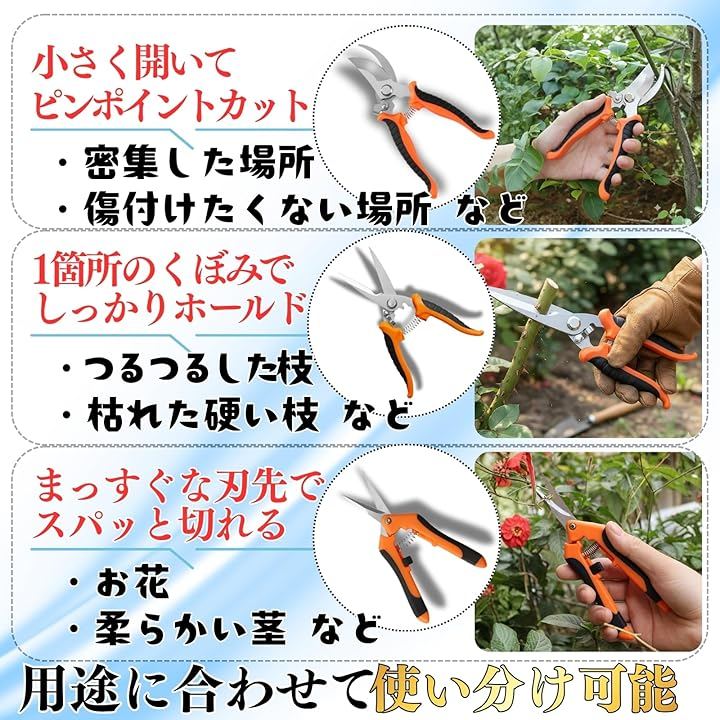 細枝・若枝の剪定、整枝、摘果、収穫作業に最適で、用途別に使い分けることで作業効率が向上。
