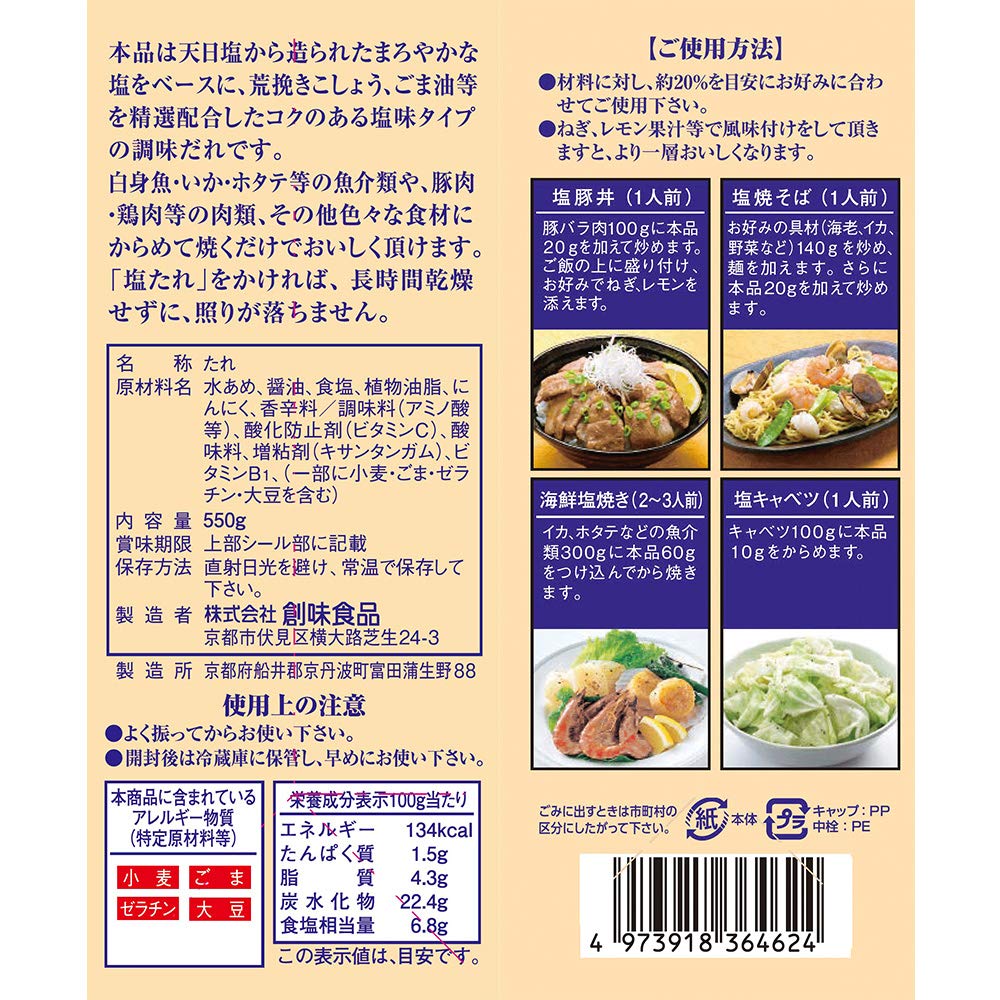 創味の大人気業務用商品『塩たれ』が手軽な家庭用サイズで登場! 内容量 550g 紙パック(ボトルキャップ付) 材料に対し、約20%を目安にお好みに合わせてご使用下さい。 塩豚丼・塩焼きそば・海鮮塩焼き・塩キャベツ、などにお使いいただけます。 本品は天日塩から造られたまろやかな塩をベースに、荒挽きこしょう、ごま油等を精選配合したコクのある塩味タイプの調味だれです。白身魚、いか、ホタテ等の魚介類や、豚肉鶏肉等の肉類、その他いろいろな食材にからめて焼くだけでおいしくいただけます。【重要】メーカーによる商品リニューアルに伴いパッケージ(内容量も含む)変更が行われた場合、新パッケージでお届け致します事ご了承願います。