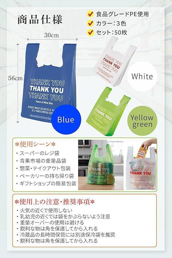 「商品仕様」 素材:高密度ポリエチレン(HDPE)/サイズ:幅30cmx高さ56cm(マチ16cm)/カラー:ホワイト・ブルー・グリーン/厚み:3層構造/入数:50枚入り/食品対応:可