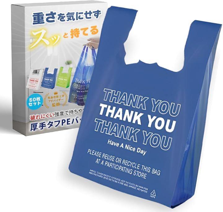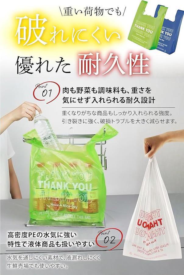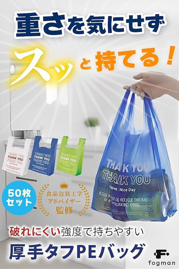 「商品仕様」 素材:高密度ポリエチレン(HDPE)/サイズ:幅30cmx高さ56cm(マチ16cm)/カラー:ホワイト・ブルー・グリーン/厚み:3層構造/入数:50枚入り/食品対応:可