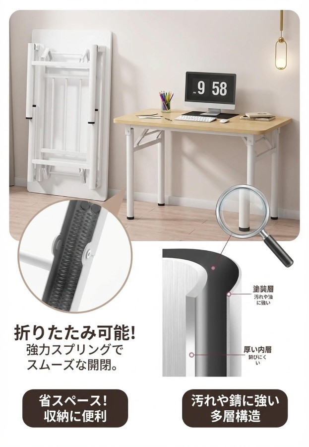 折りたたみ式構造により、使わない時はコンパクトに収納でき、省スペースを実現。