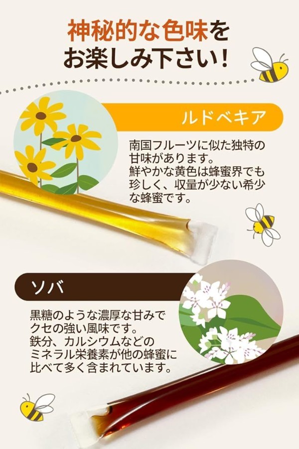 一種類の花から丁寧に採れた単花蜜だからその花本来の純粋な美味しさとそれぞれの花が持つ特有の香りがスティック一本にギュっと詰まっています。