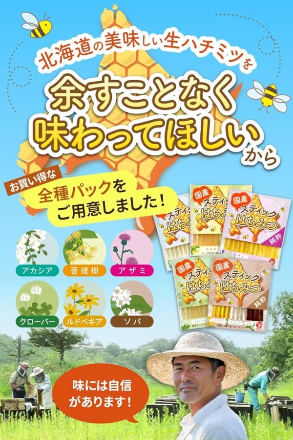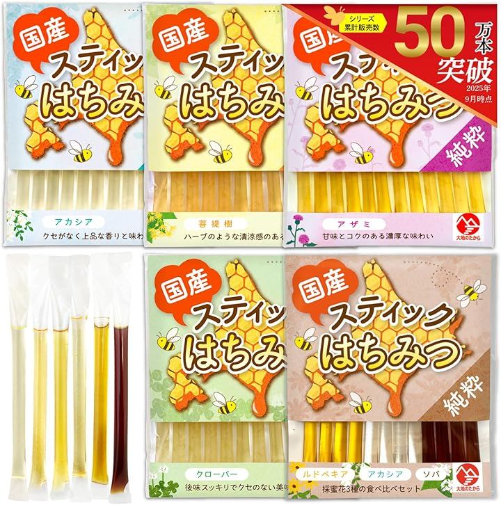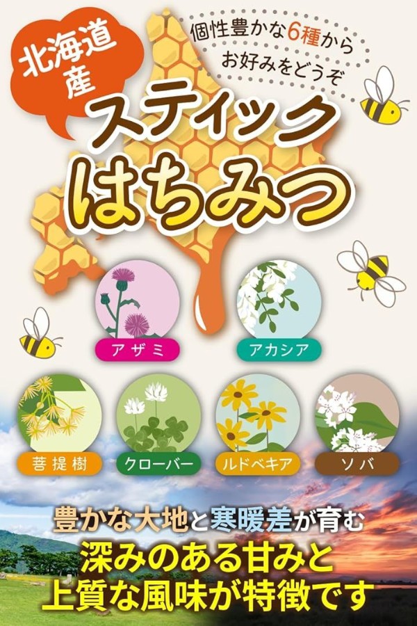 味: 6種よくばりセット(アザミ&アカシア&菩提樹&クローバー&ソバ&ルドベキア) サイズ: 60本 × 2.5g |