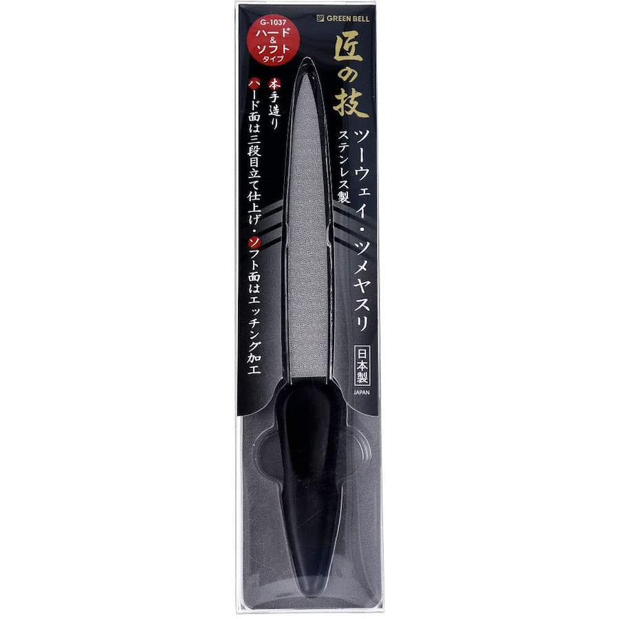 商品紹介●ハード&ソフトタイプ。仕上がりキレイに。●爪の長さ・形を美しく整える、粗さの異なるツーウェイタイプ。●キメが細かく滑らかに仕上がります。●細部にまでこだわった職人技の光る逸品です。●ハード面・三段目立て仕上げ。爪に引っかかりが良く削れます。長さの調節に活躍します。●ソフト面・鮫肌のような特殊加工。目が微粒で仕上げに活躍します。原材料・成分【品質表示】本体:ステンレス刃物鋼ヤスリ部:クロスカット(三段目立)・ステンレス特殊加工(エッチング)グリップ:エラストマー
