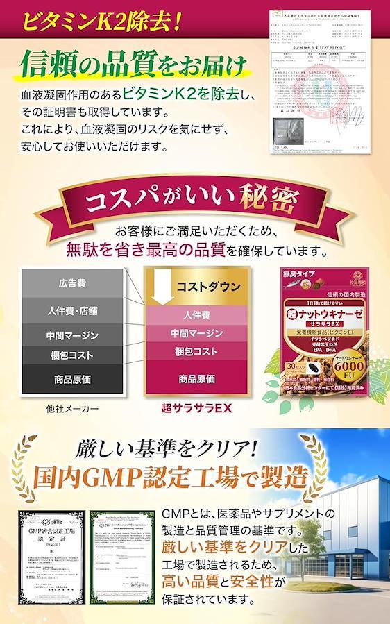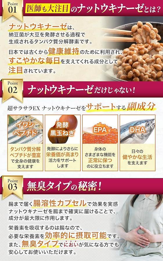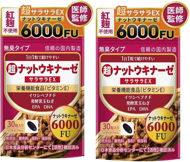 「ナットウキナーゼ含有量6000FU」超サラサラEXは、1日1粒で6000FUのナットウキナーゼをしっかり摂取できるサプリメントです。