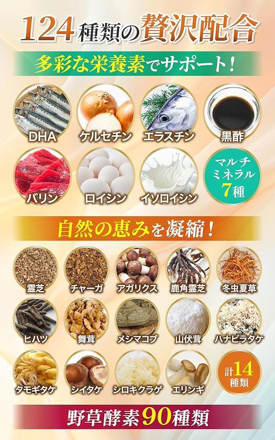 「124種類の副成分配合」主成分のナットウキナーゼに加え、イワシペプチド、発酵黒玉ねぎ、EPA、DHA、野草酵素など124種類もの副成分をバランスよく配合しています。